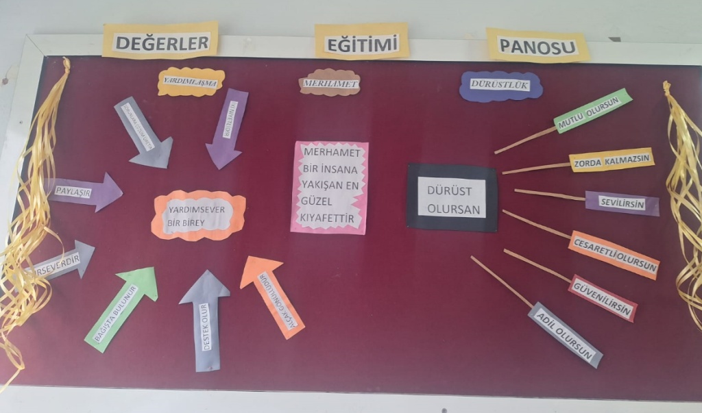 Değerler eğitimi çalışmaları kapsamında öğrencilerimiz Yardımlaşma ve Hoşgörü ile ilgili pano oluşturarak arkadaşlarını bilinçlendirdiler.